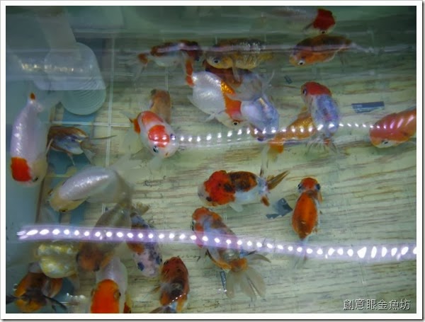 除了一盆是裡是擺繡球金魚之外,其他四盆都是擺小龍睛蝶尾,淺水加植物沒打氣,龍睛蝶尾也還撐得過去,可見得生命力還蠻強的,這一盆比較特殊的是有一隻白身但紅方頂的花色以及三色的龍睛蝶尾。