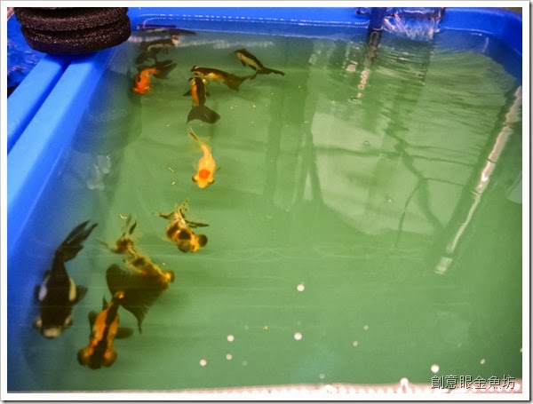 講到這邊,大家一定很納悶,這跟金魚坊的進魚快訊有啥關係呢?噹!噹!噹!我有跟雙溪&麒麟水族事先協商,等展覽結束後,我等展場服務人員魚隻打包交接回來後,第一時間第一手挑選魚隻,所以我將這裡面總數約30隻的小龍睛蝶尾,挑選出我認為最佳的7隻帶回來啦,下圖就是帶回來的其中幾隻,比較明顯好便是的就是包金黑通背與紅單頂龍睛蝶尾,保證確實是展場貨,最上面的那隻黑白色的,不是展場魚,而是黑白熊貓金魚,不過因為抓的時間很接近,就一起檢役。